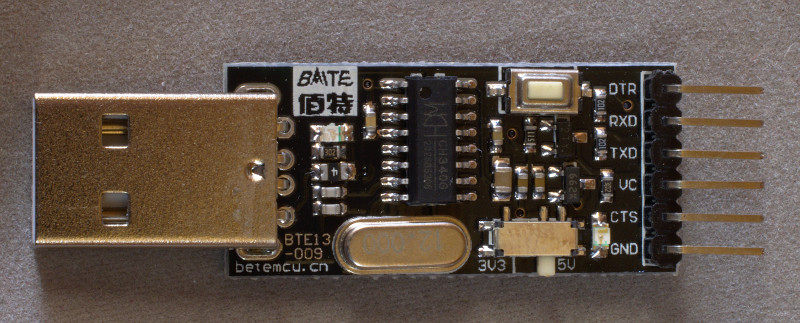 The familiar component that has a USB connector on one side and a TTL serial interface on the other. Often these are based on the FTDI chip. I used one based on the CH340G.