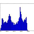 The histograms do not look very random. As a crude test I plotted the inverse time of cycle N against that of cycle N+1. It seems that a short cycle is followed by a long one. I found a similar histogram in [4], which says it represents "deterministic jitter".