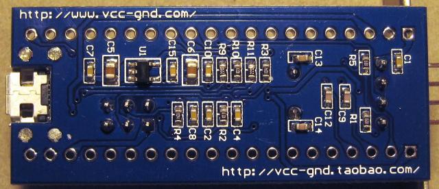 Looking for something like the Arduino Pro Mini but with better performance I bought a board off ebay with the ARM based STM32F103C8T6 chip on. I found the schematic here [9]. Click the photos to see full size.