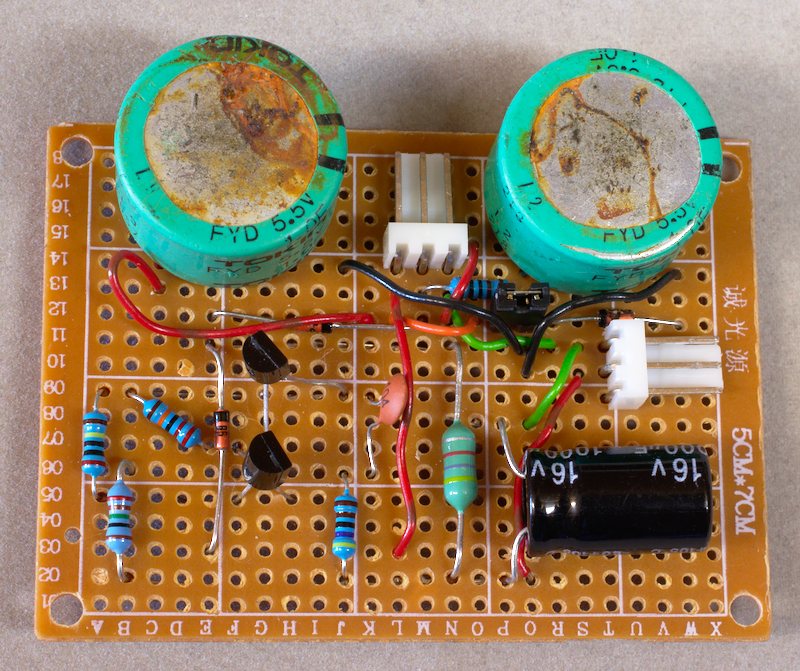 Investigation of the garden light version showed a standby current around 80 μA a lot more than the 20 μA mentioned at the start. Replacing the yx8018 with the one I'd first tested reduced the current drawn to around the 20 μA figure. Under the low light conditions for the long period mentioned the standby current has been too big. Using one of the designs on the DCDC page would have given better results.